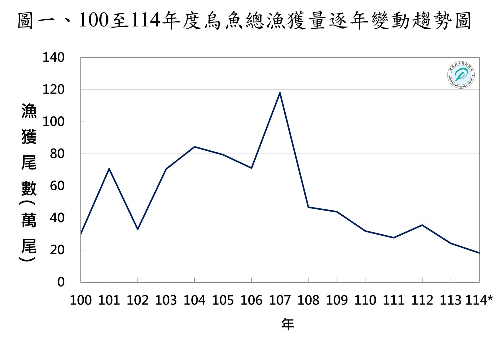 根據彙整記錄,全臺洄游性烏魚總捕獲量約為 182,784 尾。相較去年(113)捕獲量24萬尾,顯著減少約6萬尾(銳減24.8%),產量位居近十年來之最低點(如圖一)。