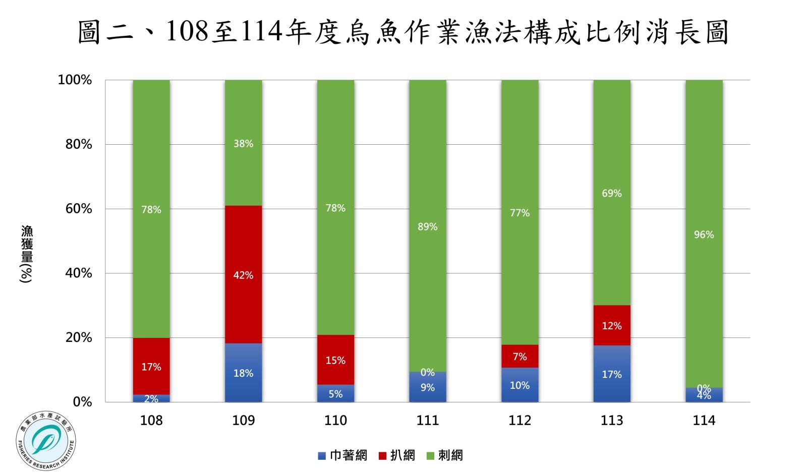 本年度漁獲主要以刺網類為主(占 95.6%),其次為巾著網(4.38%)及拖網(0.04%),扒網則無漁獲記錄。近年漁法組成顯示,刺網之占比逐年升高,本年度幾乎主導整體作業(如圖二)。