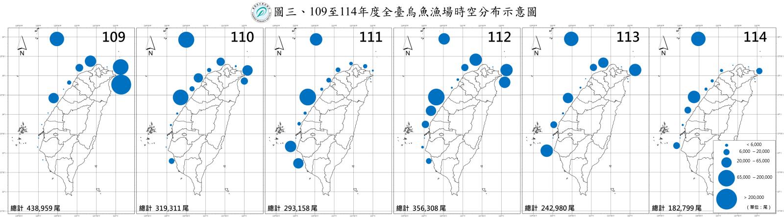 - 中彰海域:捕獲約7.1萬尾(39.2%),較去年(2.5萬尾)顯著增加,為次要漁場。