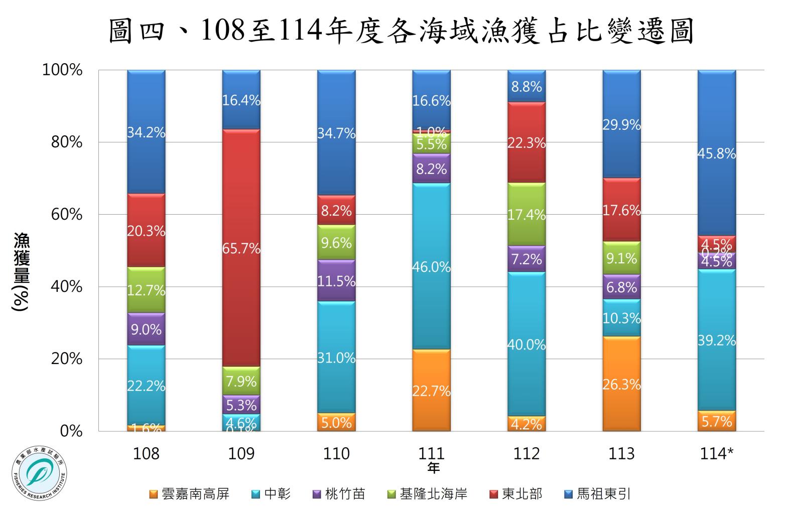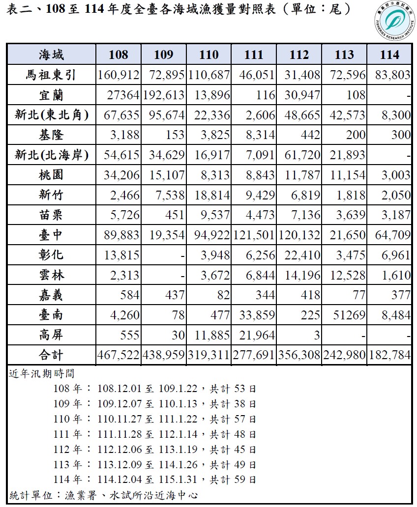 - 桃竹苗海域:捕獲約8,240尾(4.5%),較去年(1.6萬尾)略微下降。