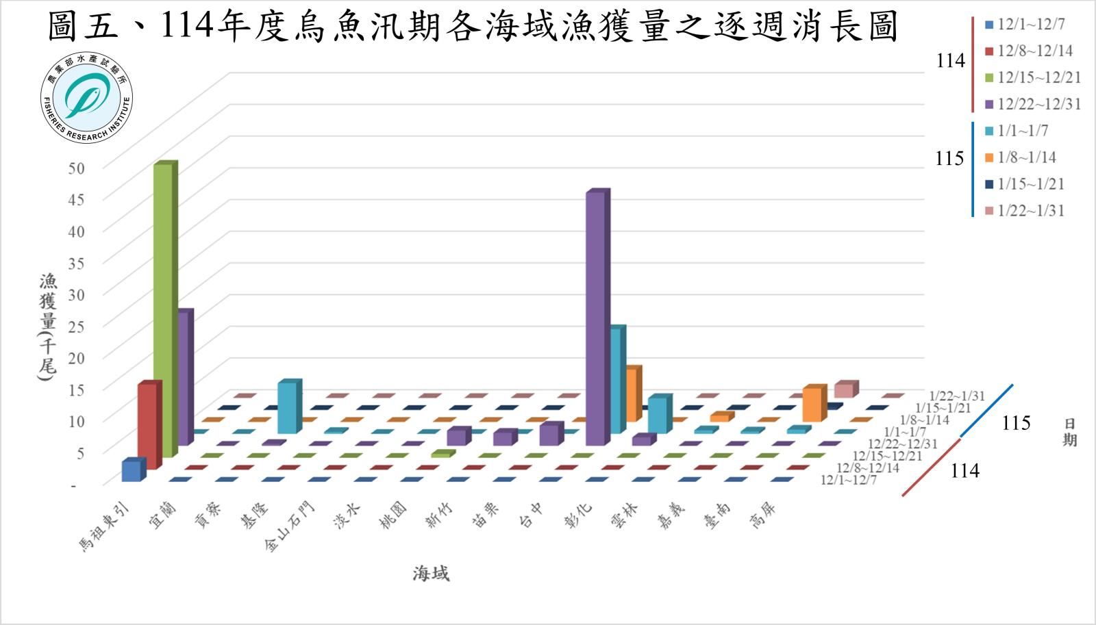本年度整體受「弱反聖嬰」現象影響,寒流波動強度與往年持平,逐週漁況變化如下(如圖五)- 初期(12 月上旬至下旬):首波高峰期