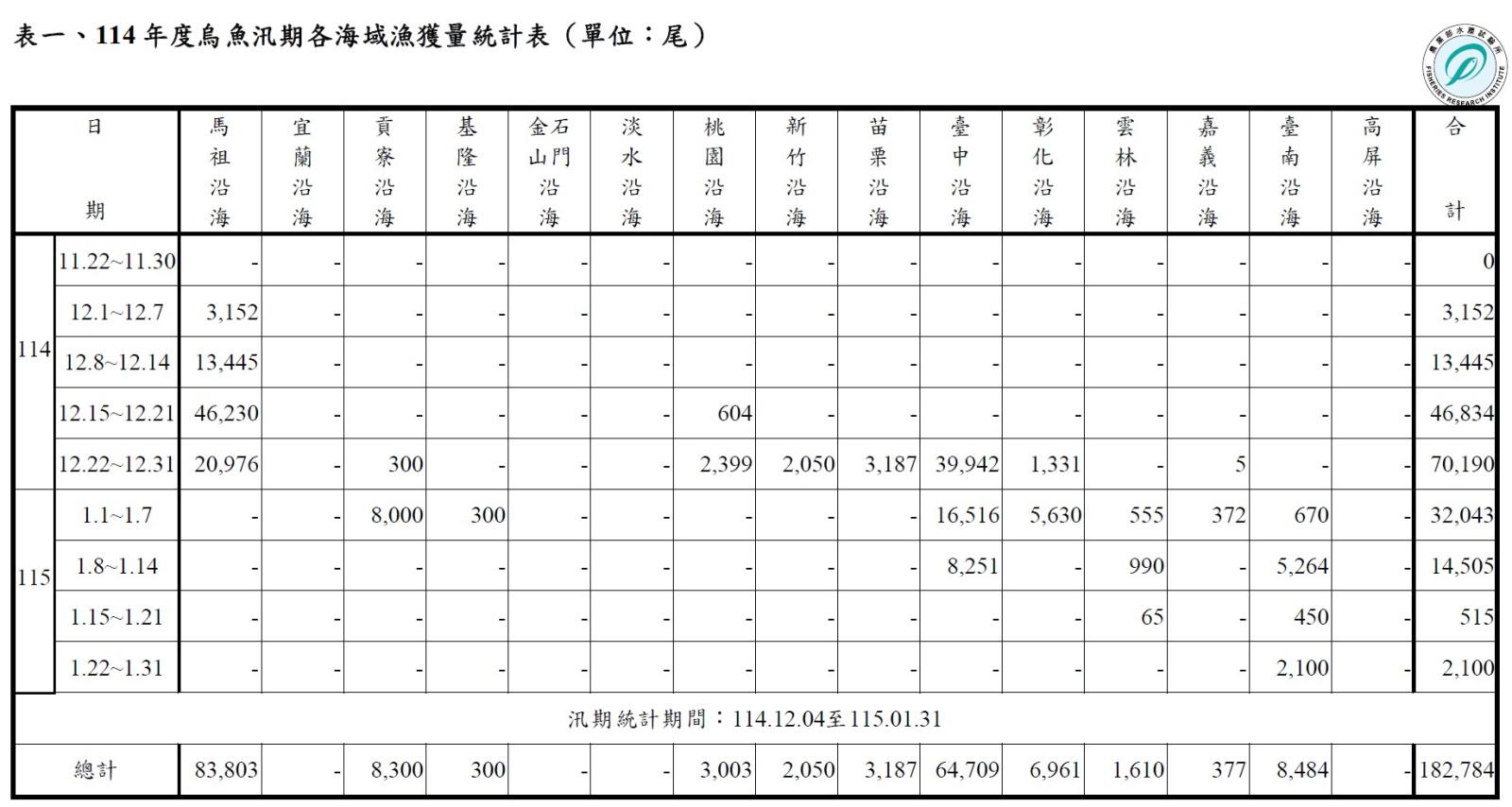 本年度烏魚漁汛期自114年12月4日起至115年1月31日,共計59日。與去年同期相比,起始時間提早約5日,結束時間則延後5日(113年汛期為113年12月9日起至114年1月26日)。