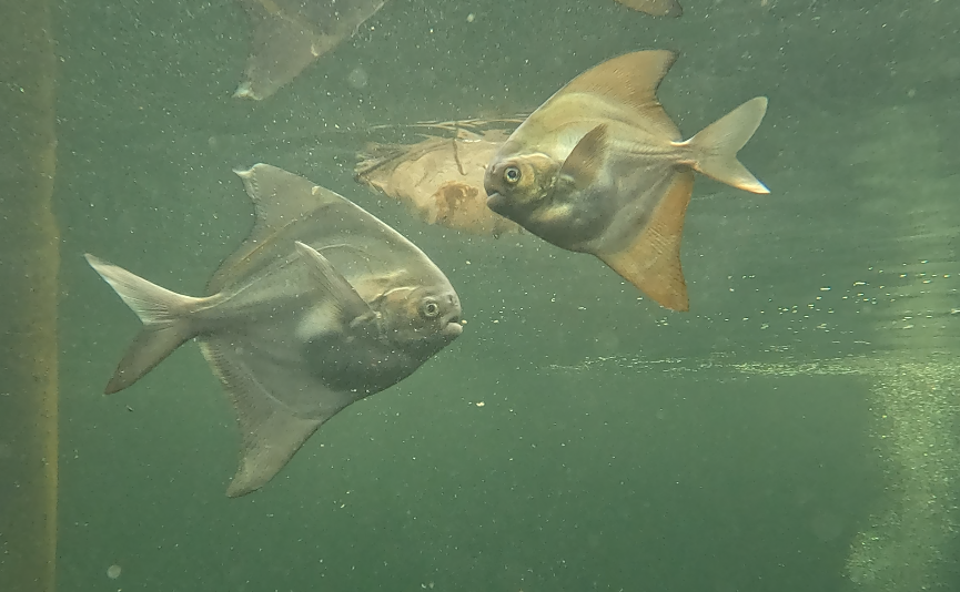 由於消費市場對鯧魚的需求強勁,產量又逐年減少,故建立人工繁養殖技術有其潛在的商業價值。鯧魚養殖的困難點包括體表鱗片極易脫落導致感染死亡、易受驚嚇造成緊迫死亡以及喜食水母轉換成人工餌料非常困難等。目前全球僅科威特及中國的研究團隊已有銀鯧繁殖成功的報告。臺灣西部沿海最常見且產量最大的是斗鯧 (圖1),本所研究團隊與中南部船長合作成功捕捉活魚,目前已蓄養超過10個月以上 (圖2)。